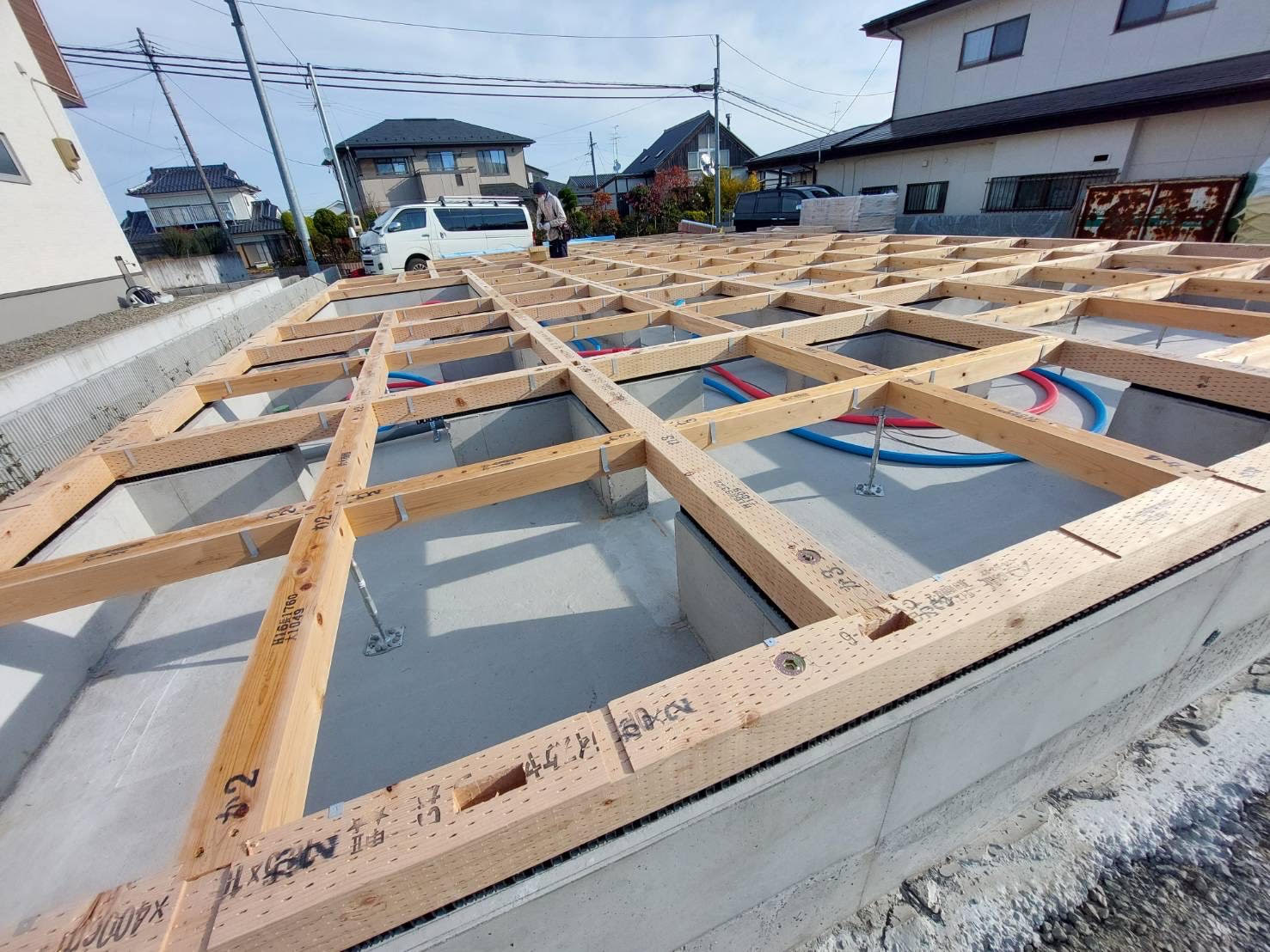 基礎の上に整然と土台が組み上げられています。